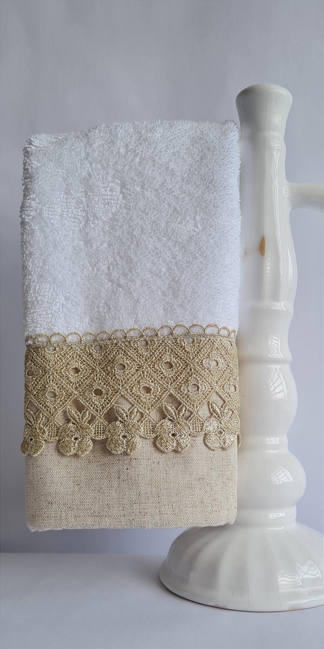 Toque delicado e elegante com acabamento em linho misto e renda.